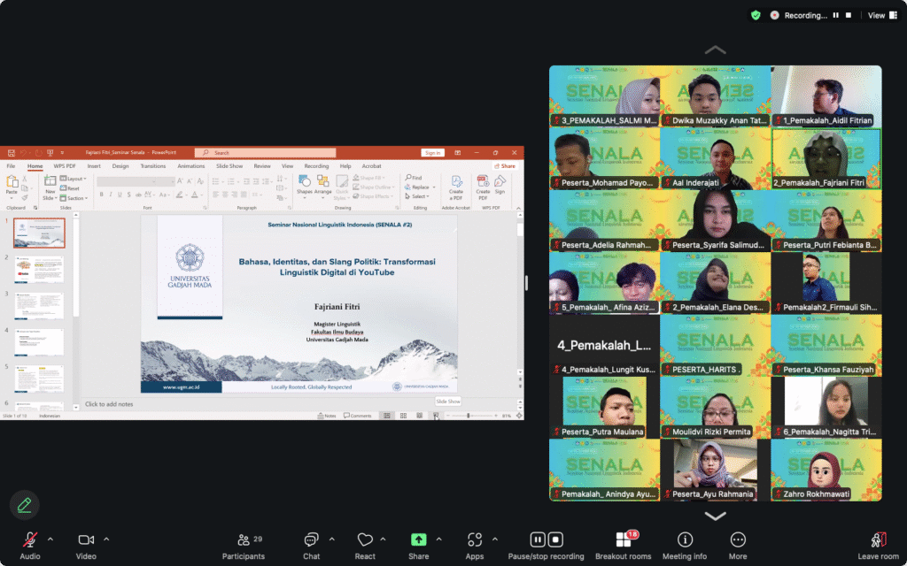 Seminar Nasional Linguistik Indonesia (SENALA) UPN Veteran Jawa Timur tak hanya menjadi ajang presentasi hasil riset, tetapi juga medan dialog strategis untuk menyongsong era transformasi linguistik digital. Dengan tema besar “Transformasi Linguistik Digital di Era Big Data”, sesi paralel yang digelar selama dua hari (2 – 3 Oktober 2025) via ruang virtual ini menyajikan keberagaman isu dan pendekatan—dari korpus digital, literasi media, dakwah daring, hingga evolusi meme dan humor digital.