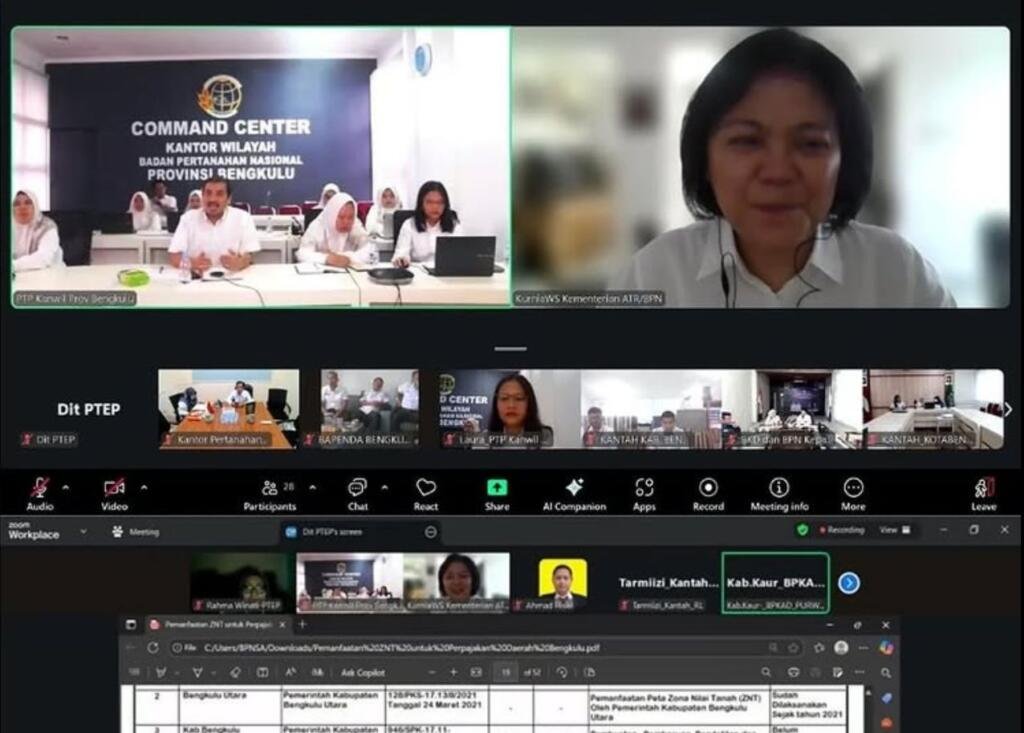 Jakarta – Direktorat Penilaian Tanah dan Ekonomi Pertanahan (PTEP) menggelar rapat koordinasi Perencanaan Kerja Sama Pendetilan Zona Nilai Tanah (ZNT) di Provinsi Bengkulu pada Rabu 3 September 2025 melalui zoom meeting.