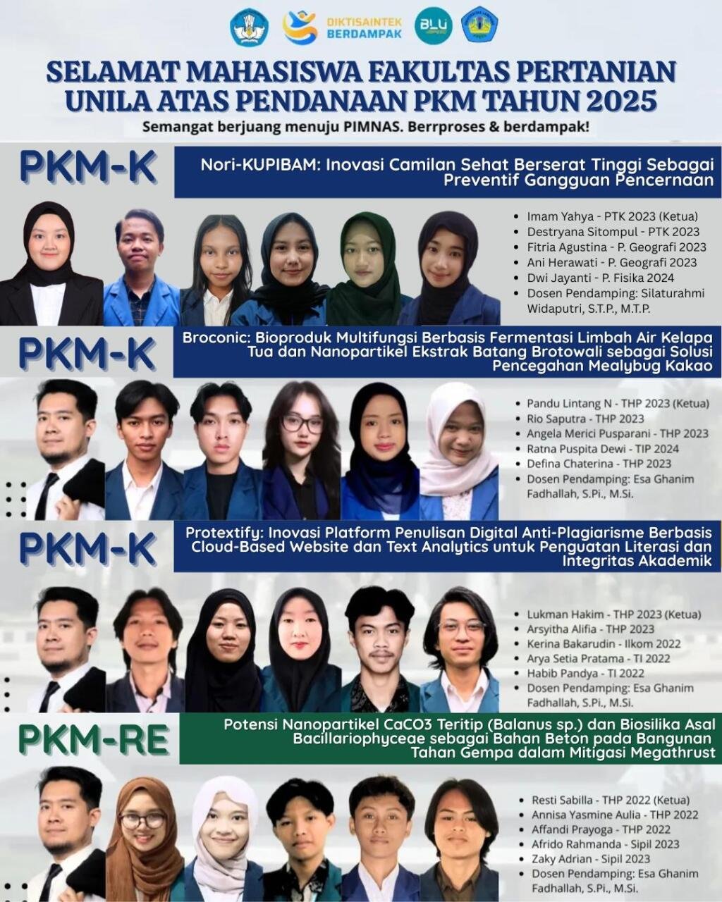 Tim ini juga terdiri atas Destryana Sitompul (Peternakan 2023), Fitria Agustina dan Ani Herawati (Pendidikan Geografi 2023), serta Dwi Jayanti (Pendidikan Fisika 2024), dengan bimbingan dari Silaturahmi Widaputri, S.TP., M.TP.
