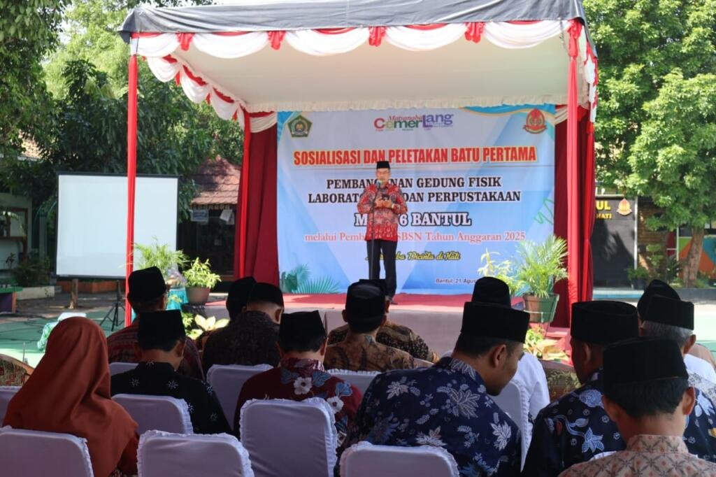 Bantul (MTs Negeri 6 Bantul) – Kepala Bidang Pendidikan Madrasah (Kabid Penma) Kantor Wilayah Kementerian Agama Daerah Istimewa Yogyakarta, Shidiq Pramono, memberikan laporan pembangunan gedung baru yang didanai melalui Surat Berharga Syariah Negara (SBSN) Tahun Anggaran 2025 MTs Negeri 6 Bantul di halaman madrasah pada Kamis (21/08/2025).