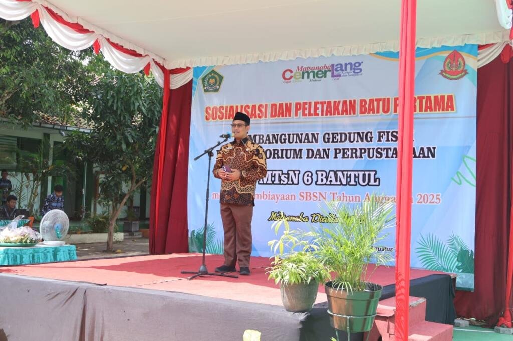 Bantul (MTsN 6 Bantul) – Kepala Kantor Wilayah Kementerian Agama Daerah Istimewa Yogyakarta, Ahmad bahiej memberikan arahan sekaligus sambutan dalam acara Sosialisasi dan Peletakan Batu Pertama pembangunan gedung fisik Perpustakaan dan Laboratorium MTsN 6 Bantul melalui anggaran Surat Berharga Syariah Negara (SBSN) tahun 2025, Kamis (21/08).