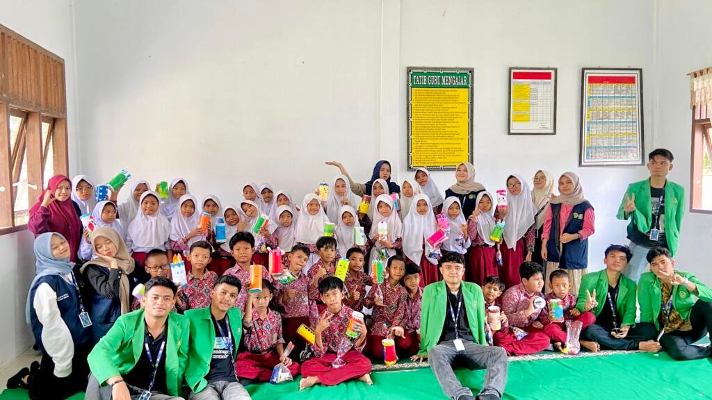 Kegiatan ini tidak hanya bersifat teori. Sebagai bentuk praktik, mahasiswa KKN mengajak siswa-siswi membuat celengan dari botol plastik bekas yang dihias dengan kreativitas masing-masing. Dengan penuh antusias, anak-anak memotong, menempel, dan menghias hingga tercipta celengan-celengan unik yang menjadi hasil karya mereka sendiri. Aula sekolah pun dipenuhi keceriaan, tawa, dan rasa bangga dari siswa yang menunjukkan hasil celengannya.