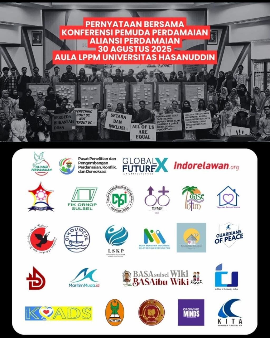 Makassar, 30 Agustus 2025, Puluhan pemuda pegiat perdamaian dari berbagai latar belakang berkumpul di Makassar untuk mengikuti Konferensi Pemuda Perdamaian United for Peace 2025. Acara yang diselenggarakan di Aula LPPM Universitas Hasanuddin ini menjadi wadah strategis bagi para peserta untuk merumuskan langkah nyata dan kolaboratif dalam merespons meningkatnya kasus kekerasan di Indonesia. Kegiatan yang didukung oleh berbagai lintas organisasi di antaranya Center For Peace, Conflict and Democracy (CPCD) Unhas. Direktur Lembaga Studi Kebijakan Publik (LSKP), M. Kafrawy Saenong turut aktif dalam kegiatan tersebut.