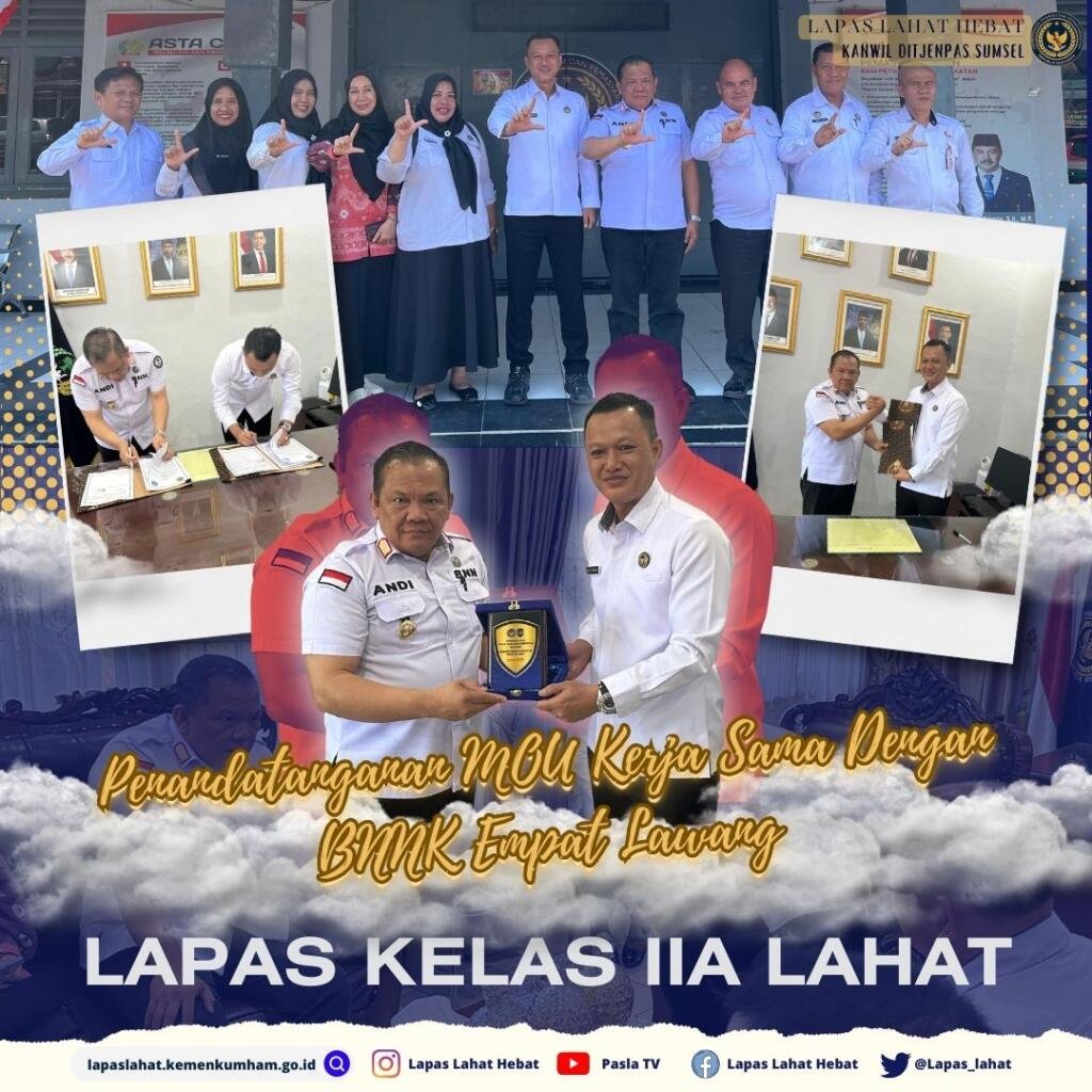 Lahat, 27 Agustus 2025 – Lembaga Pemasyarakatan Kelas IIA Lahat kembali menunjukkan komitmennya dalam mendukung Program Akselerasi Menteri Imigrasi dan Pemasyarakatan. Pada hari ini, bertempat di Lapas Kelas IIA Lahat, dilakukan penandatanganan Memorandum of Understanding (MoU) kerja sama dengan Badan Narkotika Nasional Kabupaten (BNNK) Empat Lawang.