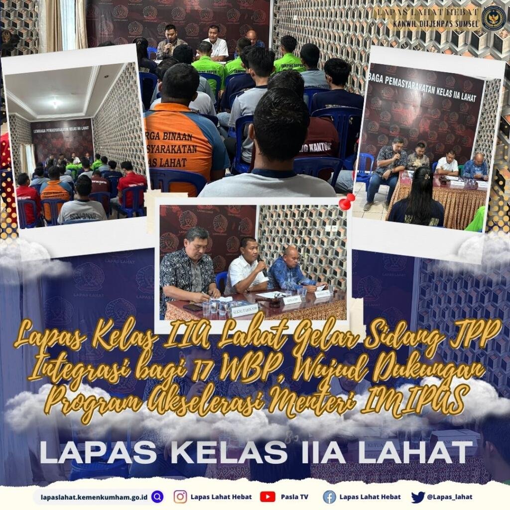 Lahat, 22 Agustus 2025 – Sebagai bentuk nyata mendukung program akselerasi Menteri Imigrasi dan Pemasyarakatan (IMIPAS) dalam mengatasi persoalan overcrowding dan overcapacity, Lembaga Pemasyarakatan (Lapas) Kelas IIA Lahat menggelar sidang Tim Pengamat Pemasyarakatan (TPP) Integrasi terhadap 17 Warga Binaan Pemasyarakatan (WBP), Jumat (22/08).