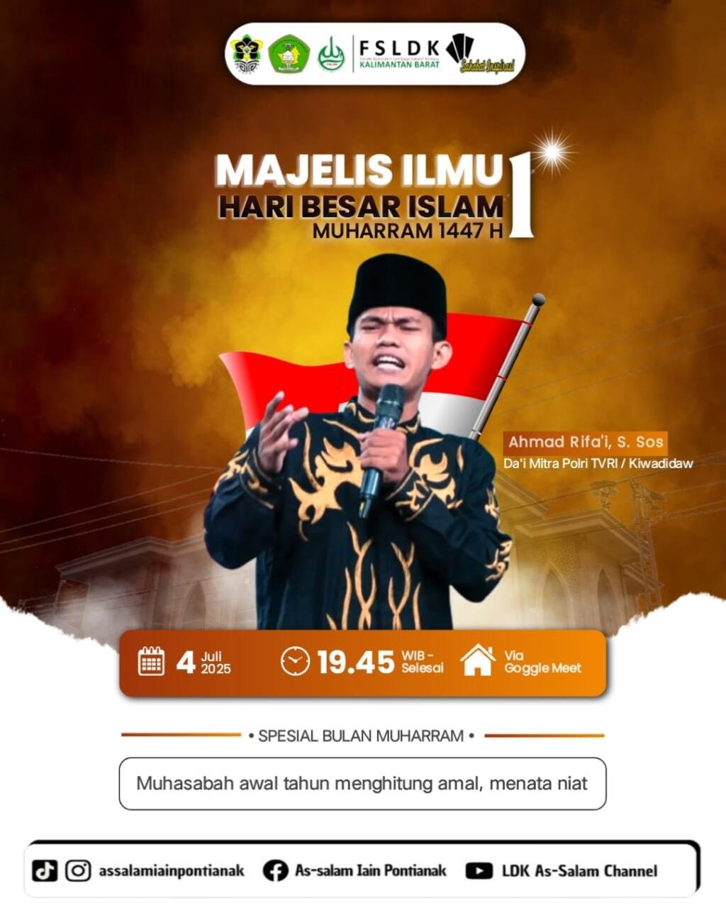 Sabtu malam, 4 Juli 2025, menjadi malam yang tak biasa. Google Meet yang biasanya digunakan untuk rapat organisasi atau kelas daring, malam itu disulap menjadi ruang kajian virtual yang penuh gelak tawa, semangat ukhuwah, dan tentunya aliran ilmu yang deras. LDK Assalam menghadirkan sosok istimewa, Ustaz Ahmad Rifai, seorang da’i muda yang dikenal sebagai Dai Mitra Polri sekaligus motivator Islam yang tidak hanya lantang dalam berbicara, tapi juga dalam menyemangati jiwa-jiwa muda agar bangkit dan bergerak.