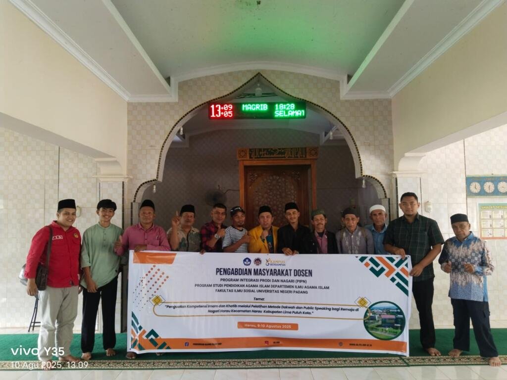Harau, 10 Agustus 2025 – Tim Pengabdian Masyarakat dari Program Studi Pendidikan Agama Islam Departemen Ilmu Agama Islam, Fakultas Ilmu Sosial, Universitas Negeri Padang (UNP) Sukses menggelar kegiatan Pelatihan Penguatan Kompetensi Imam dan Khatib dengan fokus pada Metode Dakwah dan Public Speaking bagi remaja di Nagari Harau, Kecamatan Harau, Kabupaten Lima Puluh Kota.