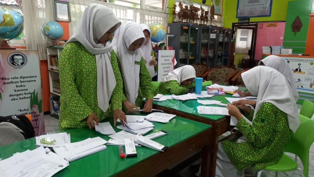 Bantul (MTsN 6 Bantul) – Suasana penuh semangat tampak di Perpustakaan De’Talenta Lib MTsN 6 Bantul ketika para siswa panitia Pemilihan Ketua dan Wakil Ketua OSIS (Pemilos) tahun 2025 sibuk mempersiapkan undangan pemungutan suara pada Rabu (3/9/2025). Dengan teliti mereka memotongi dan menata undangan yang nantinya akan dibagikan kepada seluruh siswa sebagai pemilih.