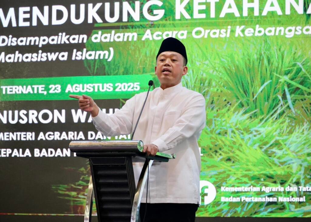 Maluku Utara – Menteri Agraria dan Tata Ruang/Kepala Badan Pertanahan Nasional (ATR/BPN), Nusron Wahid, menyampaikan orasi kebangsaan dalam Rapat Koordinasi (Rakor) Regional Korps Alumni Himpunan Mahasiswa Islam (KAHMI), di Kota Ternate, Sabtu (23/08/2025). Dalam orasinya, ia menegaskan pentingnya menggunakan keadilan sebagai dasar dalam setiap kebijakan, khususnya terkait pengelolaan tanah nasional.