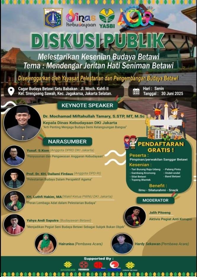 Semua yang dikerjakan atau yang ditulis hari ini akan menjadi catatan sejarah yang esok hari akan dibaca oleh banyak orang. Hari ini Senin, 30 Juni 2025 YASBI ( Yayasan Pelestarian dan Pengembangan Budaya Betawi) mengadakan acara Diskusi Publik “Melestarikan Kesenian Budaya Publik” yang bertemakan Mendengar Jeritan Hati Seniman Betawi yang bertempat di Cagar Budaya Betawi Setu Babakan Kecamatan Jagakarsa Jakarta Selatan.