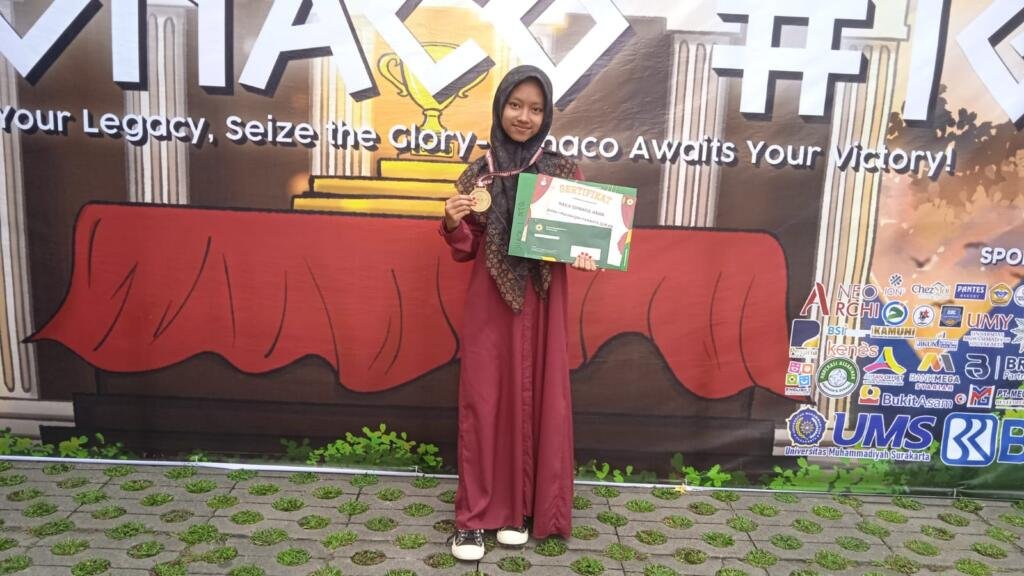 Bantul, (MTsN 6 Bantul) — Prestasi membanggakan kembali ditorehkan oleh salah satu siswa terbaik MTsN 6 Bantul, yang berhasil meraih Juara 1 Musabaqah Tilawatil Qur’an (MTQ) Tingkat Nasional. Dalam ajang tahunan bernama MONACO (Moehi National Competition) yang diselenggarakan oleh SMA Muhammadiyah 1 Yogyakarta, Naila ‘Ishmatul Hawa mampu tampil dengan penuh percaya diri melantunkan ayat suci Al-Qur’an secara merdu, tartil, serta penuh penghayatan sehingga memukau dewan juri dan mengungguli para finalis dari berbagai provinsi. Ketekunan Naila dalam berlatih memperdalam makhraj dan tajwid, serta kemantapan suara, membuahkan hasil yang membanggakan.
